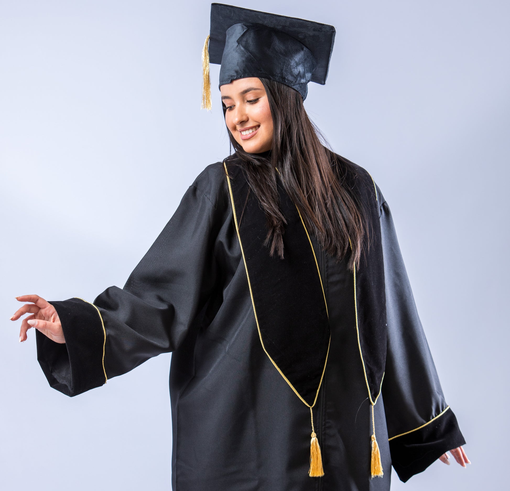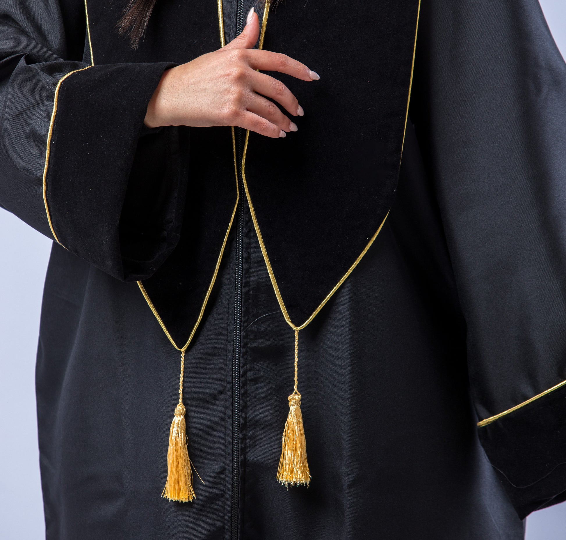 Grace à sa coupe classique et intemporelle, ses manches amples et ses extremités en velour, cette toge allie tradition et raffinement pour un rendu prestigieux.
